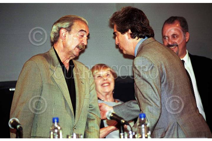 Rafael Tovar, titular de CONACULTA, felicita al escritor argentino Juan Gelman, quien fue designado esta mañana como el ganador del Premio Latinoamericano de Literatura Juan Rulfo 2000. FOTO: Pedro Mera/CUARTOSCURO.COM