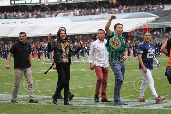 CIUDAD DE MÉXICO, 19NOVIEMBRE2017.- Raiders de Oakland y Patriotas de Nueva Inglaterra, disputaron un partido de temporada regular de la NFL, en el Estadio Azteca, en donde los "Pats" se llevaron la victoria por 33-8. En la imagen, deportistas mexicanos destacados recorrieron la cancha, previo al encuentro. FOTO: LUIS CARBAYO / CUARTOSCURO.COM