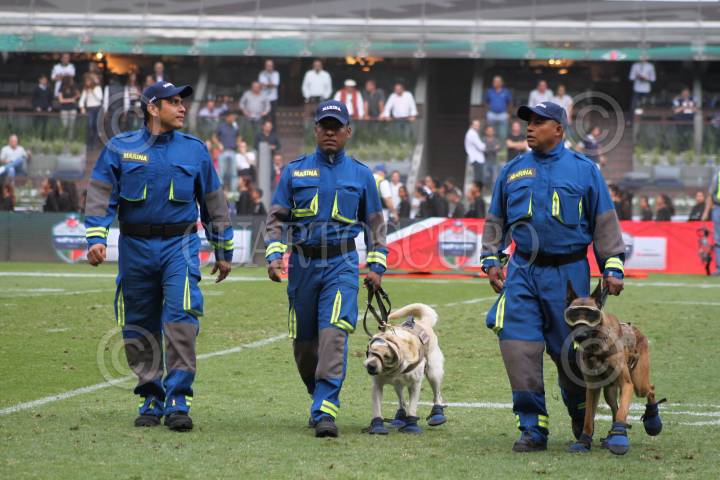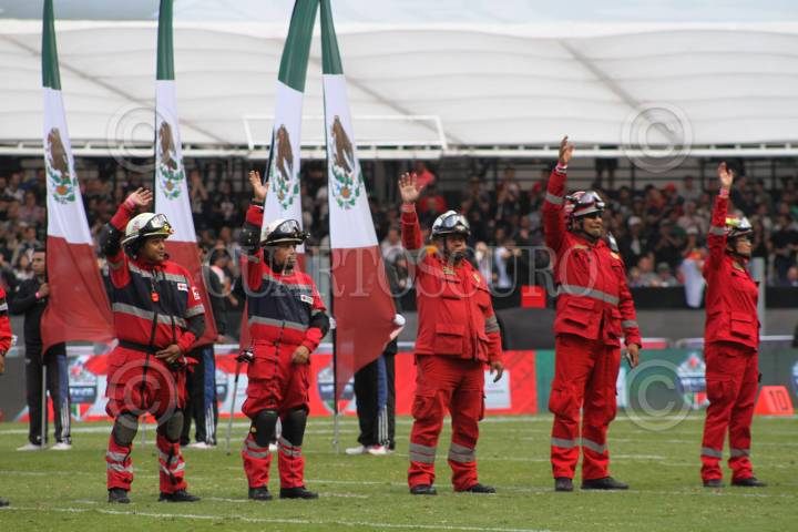 CIUDAD DE MÉXICO, 19NOVIEMBRE2017.- Raiders de Oakland y Patriotas de Nueva Inglaterra, disputaron un partido de temporada regular de la NFL, en el Estadio Azteca, en donde los "Pats" se llevaron la victoria por 33-8. En la imagen, se rindió un homenaje a los rescatistas del pasado sismo del 19 de septiembre. FOTO: LUIS CARBAYO / CUARTOSCURO.COM