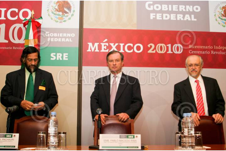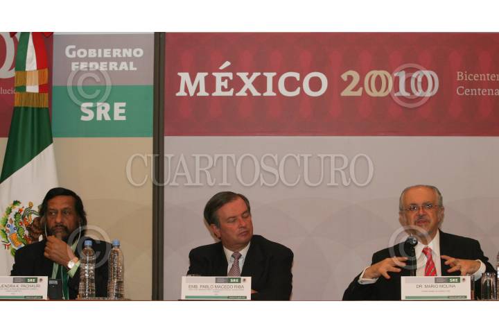 MÉXICO, D.F., 03AGOSTO2010.- Rajendra K. Pachauri, Presidente del Panel Internacional sobre el Cambio Climático, junto a el embajador Pablo Macedo Riba, Director General para la Organización de las Naciones Unidas, y Mario Molina, Premio Nobel de Química 1995, durante el foro "Importancia de la Ciencia del Cambio Climático en el proceso de la COP". FOTO: ENRIQUE ORDÓÑEZ/CUARTOSCURO.COM