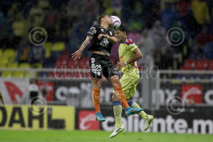 CIUDAD DE MÉXICO, 03AGOSTO2023. Illian Hernández y Ramón Juárez del América disputan una pelota durante el partido de fútbol América vs Pachuca correspondiente a la jornada 11 del Torneo Apertura 2023 de Liga BBVA MX, en el Estadio Azteca. FOTO: EDGAR NEGRETE/CUARTOSCURO.COM