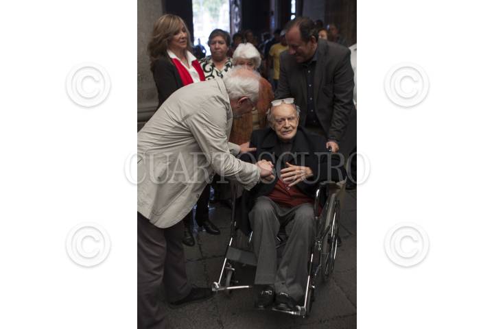 MÉXICO, D.F., 11ABRIL2015.- El poeta y ensayista Ramón Xirau recibió un homenaje por parte de la Secretaría de Cultura del DF, el acto se realizó en el Monumento de la Ciudad. En la imagen saluda a Cuauhtémoc Cárdenas Solórzano. FOTO: MOISÉS PABLO /CUARTOSCURO.COM