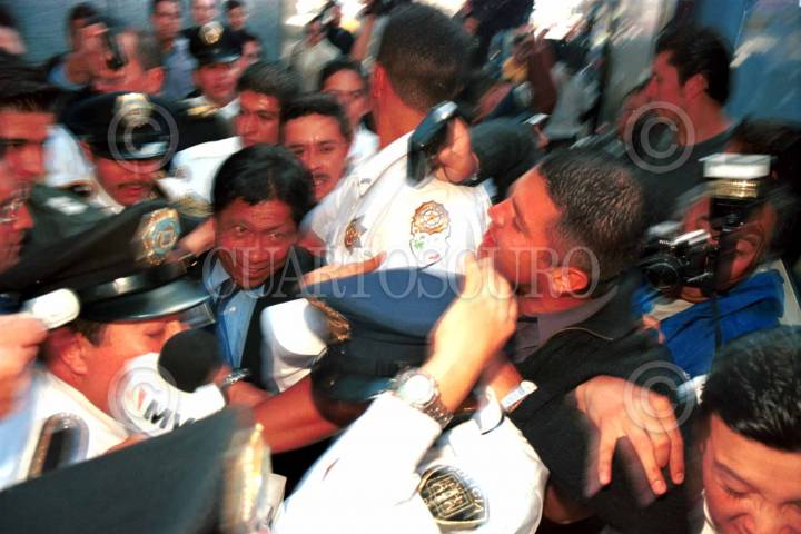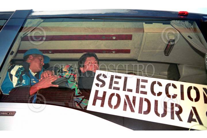 Con cinco horas de retraso y entre empujones y jaloneos, la selección de Honduras arribo esta tarde al Aeropuerto Internacional de la Ciudad de México. Aqui el director técnico Ramón Madariaga es escoltado por elemntos de la PFP y de Seguridad Pública del aeropuerto hacia el autobus que los transladaria a su hotel. FOTO: David Bolaños/CUARTOSCURO.COM