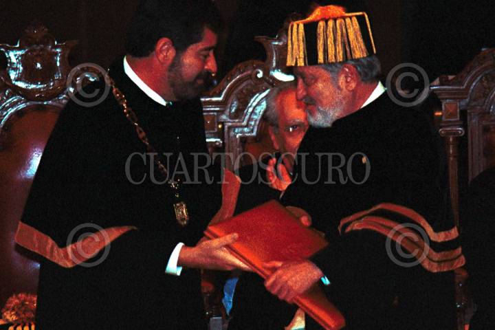 Esta mañana, Juan Ramón de la Fuente, rector de la Universidad Autónoma de México, al investir a once profesores e investigadores eméritos, en la ceremonia solemne, afirmó que en las universidades, el diálogo y no la amenaza, las palabras y no las balas, son las que determinan las acciones de los individuos y los poroyectos de la institución. FOTO: Sandra Perdomo/CUARTOSCURO.COM