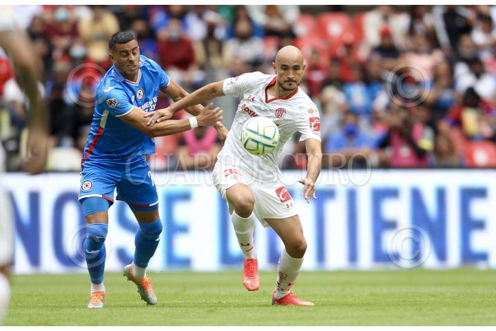 Ramiro Funes de Cruz Azul y Gabriel González de Toluca durante el partido de fútbol Cruz Azul vs Toluca correspondiente a la jornada 8 del Torneo Apertura 2022 de Liga BBVA MX, en el estadio Azteca.