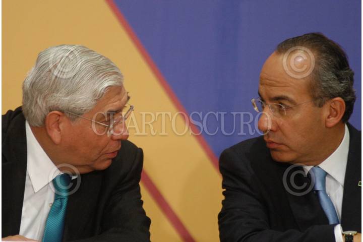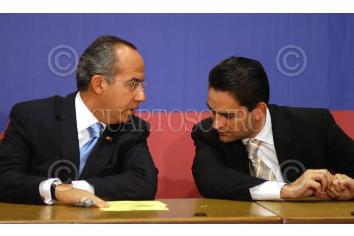 MÉXICO D.F. 22NOVIEMBRE2007.- Se llevo acabo el acuerdo nacional por una comunicación de la calidad en la residencia oficial de los pinos donde asistieron empresarios del ramo de la comunicación y el presidente de México Felipe Caldeón Hinojosa. En la imagen el presidente conversa con Juan camilo Mouriño. FOTO: SAÚL LÓPEZ/CUARTOSCURO.COM
