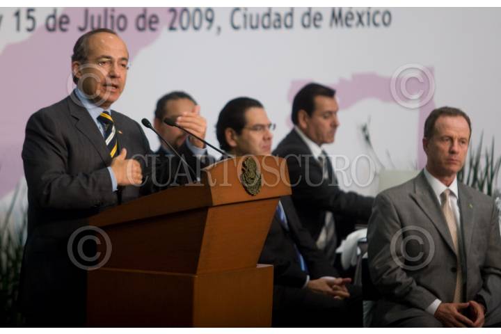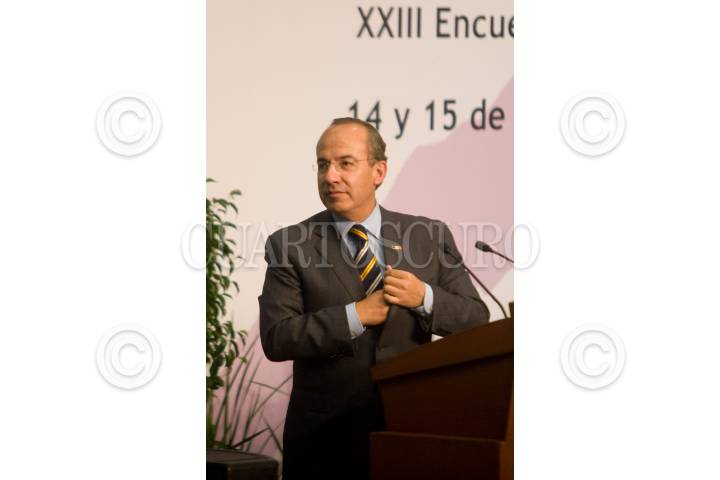 MÉXICO, D.F., 14JULIO2009.- El presidente Felipe Calderon, asistio a el XXIII Encuentro Nacional de Vivienda de la Cámara Nacional de la Industria de ese ramo (CANADEVI), durante este evento el mandatario federal abordó el tema de los enfrentamientos que se han registrado en estos días entre las fuerzas armadas y los miembros del crimen organizado y reiteró la voluntad de su gobierno. FOTO: RICARDO CASTELAN/CUARTOSCURO.COM