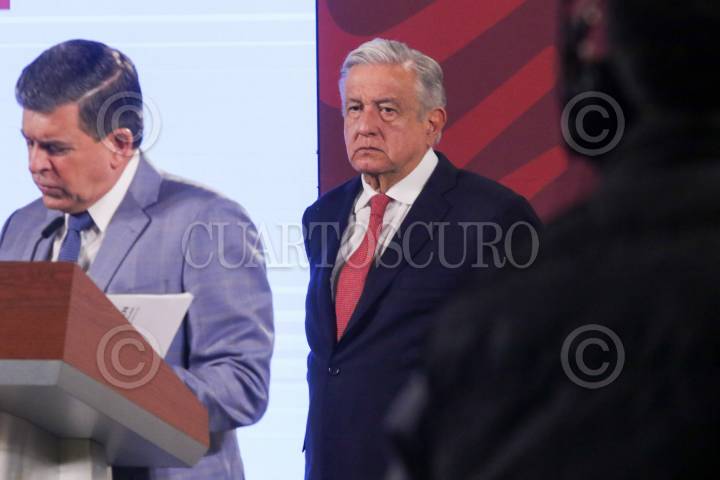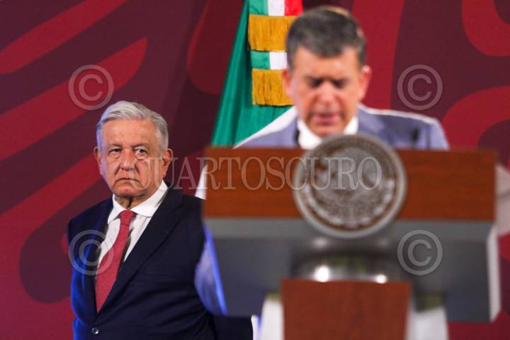 Andrés Manuel López Obrador, Presidente de México; Ricardo Sheffield Padilla, titular de la Profeco, y Raquel Sosa Elízaga, directora general del Organismo Coordinador del programa Universidades para el Bienestar “Benito Juárez García”, durante la conferencia mañanera en Palacio Nacional.