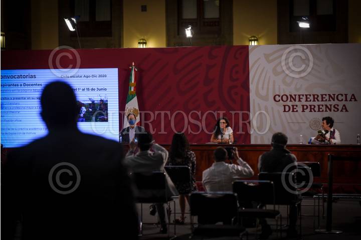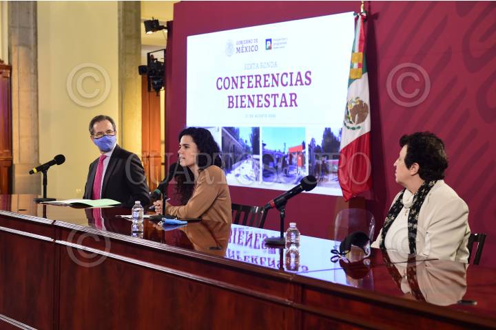 Luisa María Alcalde Luján, Raquel Sosa Elizaga, y Esteban Moctezuma, durante la conferencia de Bienestar en Palacio Nacional.