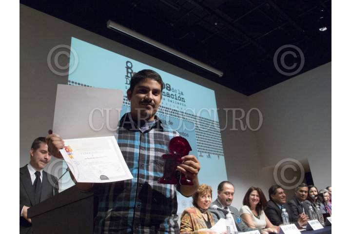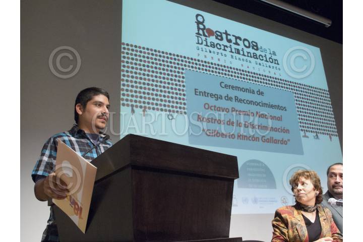 MÉXICO, D.F., 30AGOSTO2012.- El fotógrafo Enrique Rashide Serraros Frías, quien trabaja en el periódico Noroeste y colabora en la Agencia Cuartoscuro, fue galardonado con el primer lugar en la categoría de fotografía del Octavo Premio Nacional de Rostros de la Discriminación "Gilberto Rincón Gallardo", la ceremonia se celebró en el Museo de la Tolerancia. FOTO: MOISÉS PABLO /CUARTOSCURO.COM