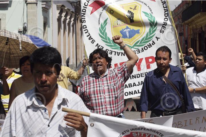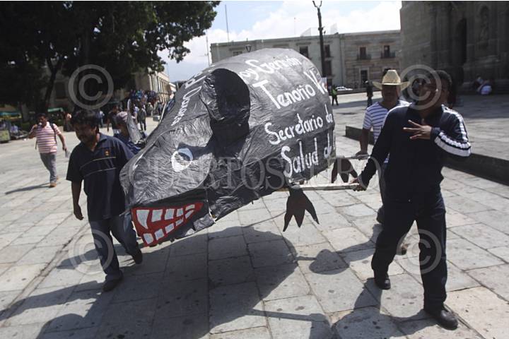 OAXACA, OAXACA, 29MAYO2014.- Integrantes del Sindicato Independiente de Trabajadores y Profesionales de la Salud (SITYPS) quemaron este jueves una rata de casi dos metros de largo y hecha de cartón frente el palacio de gobierno, esto para exigir la destitución del secretario de Salud de Oaxaca, Germán Tenorio Vasconcelos, a quien responsabilizan de lo que consideran la debacle de la dependencia, además de no dialogar con ellos para dar respuesta a su pliego petitorio. FOTO: ARTURO PÉREZ ALFONSO /CUARTOSCURO.COM