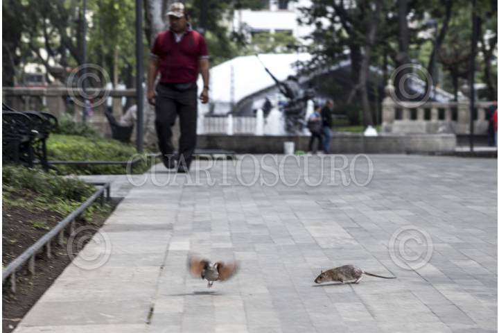 CIUDAD DE MÉXICO, 11SEPTIEMBRE2016.- Una rata intenta alcanzar a un pájaro, en la Alameda Central. En 2012, este parque fue remodelado; sin embargo, la plaga de roedores sigue presente debido a la basura que dejan los transeúntes y que sirve para alimentarlos. FOTO: TERCERO DIAZ /CUARTOSCURO.COM
