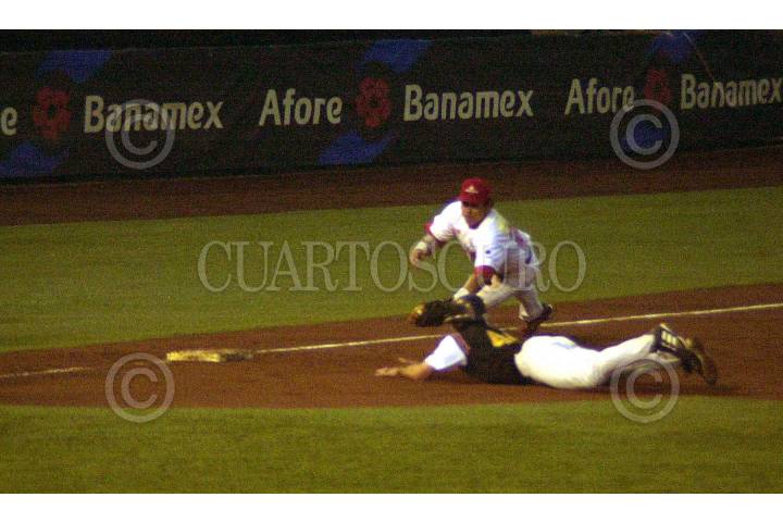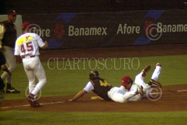 Raúl Roarte de los Cafeteros de Córdova en carrera contra Ray Martínez de los Diablos de México, se barre a tercera. Hasta la 6a entrada los Diablos ganaban 7 carreras a 3 , en el Foro Sol. FOTO: David Bolaños/CUARTOSCURO.COM
