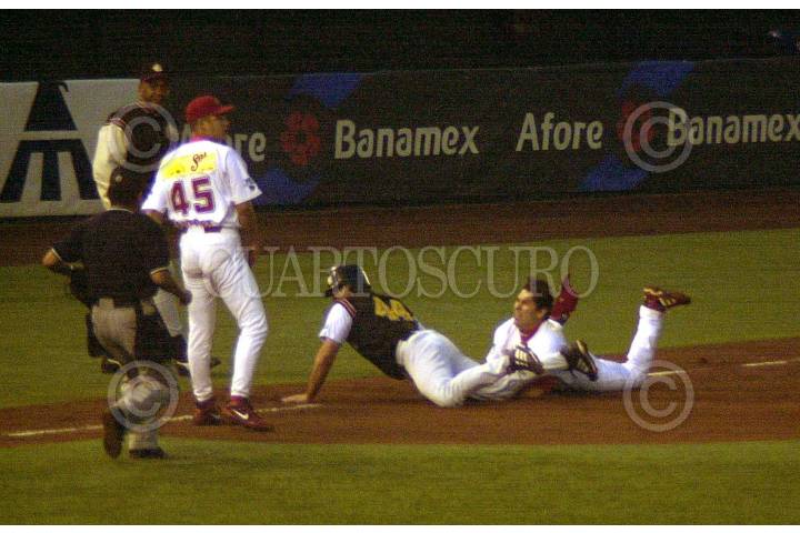 Raúl Roarte de los Cafeteros de Córdova espera la llegada del ampaller, para oir la desición de la jugada , aaunque Ray Martínez expresa su esfuerzo que al final fructifica en un out. FOTO: David Bolaños/CUARTOSCURO.COM