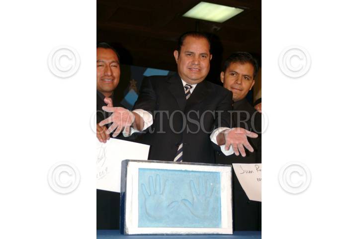 MEXICO, D.F. 05NOVIEMBRE2004.- Raymundo Espinoza, vocalista y director del grupo musical "Rayito Colombiano", estuvo presente en la plaza Galerías donde plasmó sus huellas a nombre del grupo. FOTO: Iván Stephens/CUARTOSCURO.COM