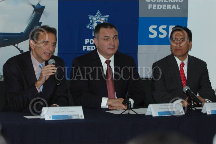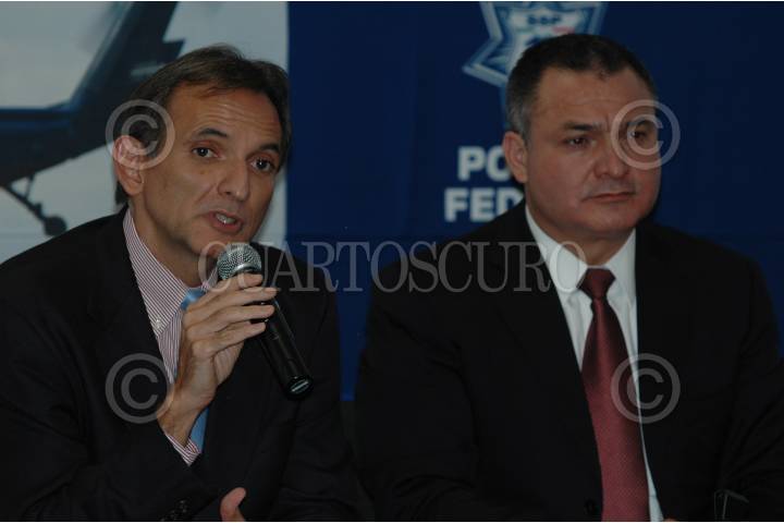 CIUDAD JUAREZ, CHIHUAHUA, 07MAYO2010.- El embajador de Estados Unidos en México, Carlos Pascual, y el Secretario de Seguridad Pública, Genaro García Luna ofrecieron hoy una rueda de prensa desde el Centro de Mando de la Policía Federal, donde los recibió el Comisionado de la PFP, Facundo Rosas Rosas. FOTO: RAYMUNDO RUIZ/CUARTOSCURO.COM