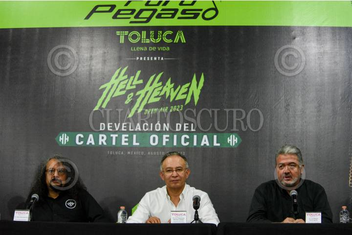 Juan Carlos Guerrero organizador del Hell and Heaven, Luis Manuel García director general del Centro Dinámico Pegaso y Foro Pegaso, y el alcalde de Toluca Reymundo Martínez Carbajal en conferencia de prensa fue presentado el cartel del Hell and Heaven 2023 que se realizará los días 3, 4 y 5 de noviembre en el Foro Pegaso en la ciudad de Toluca.