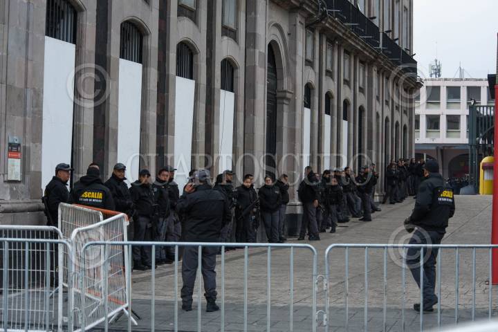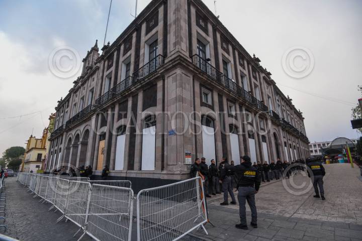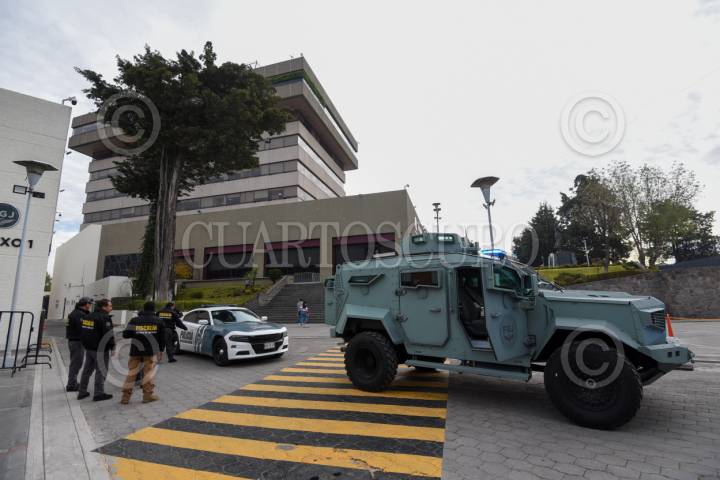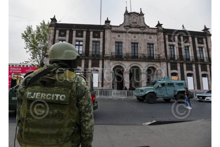 TOLUCA, ESTADO DE MÉXICO, 25NOVIEMBRE2023.- El Ayuntamiento de Toluca permanece resguardado por elementos de la FGJEM así como elementos del Ejército, como parte de los cateos realizados en diversos inmuebles en los municipios de Toluca y Metepec para cumplimentar la orden de aprehensión en contra de Raymundo “N”, presidente municipal de Toluca, por su probable participación en el delito de secuestro exprés, dichos cateos iniciaron la noche del viernes para dar con el presunto responsable. FOTO: CRISANTA ESPINOSA AGUILAR /CUARTOSCURO.COM
