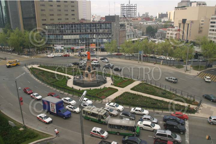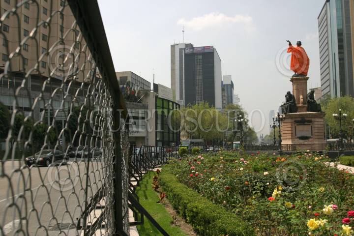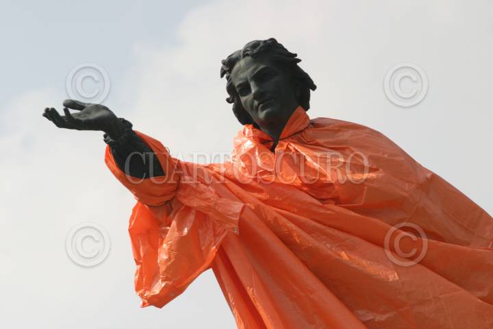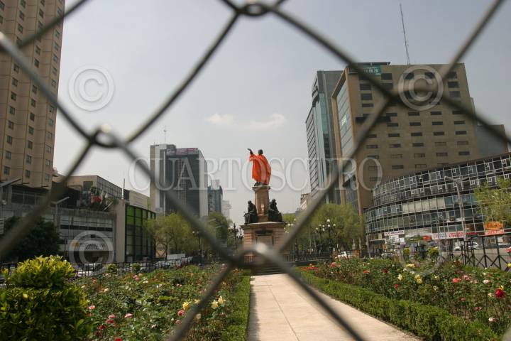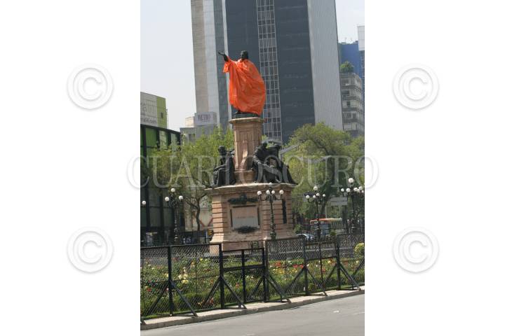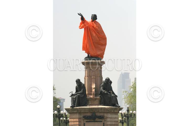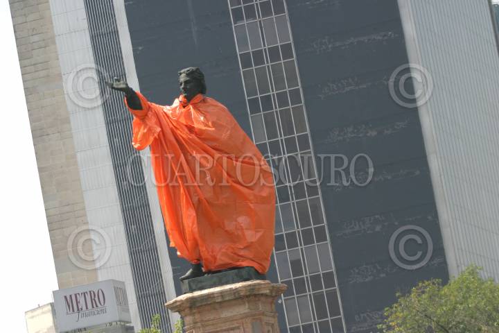 MEXICO,D.F.12OCTUBRE2007.- La estatua de Cristobal Colón ubicada sobre Paseo de la Reforma amaneció esta mañana cubierta con un impermeable naranja para protejerla de posibles agresiones durante la marcha que se realizara hoy por el Día de la Raza. FOTO:ROCIO ORTIZ/CUARTOSCURO.COM