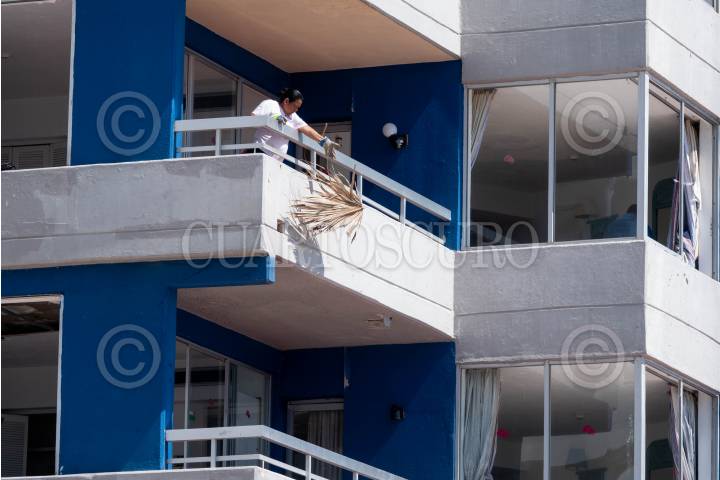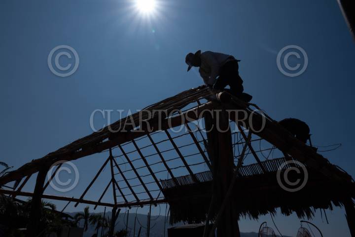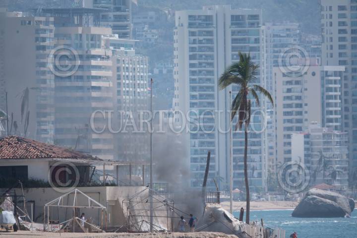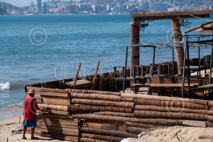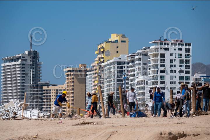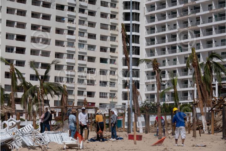 ACAPULCO, GUERRERO, 08NOVIEMBRE2023.- Trabajadores han comenzado con la reconstrucción de locales y limpieza de los hoteles en la zona de la Costera de Acapulco tras el paso del huracán Otis. Según gobierno federal se estima que en diciembre se reactiva parcialmente los complejos hoteleros y y podría ser en abril de 2024 que 35 reestrenen instalaciones. FOTO: GALO CAÑAS/CUARTOSCURO.COM