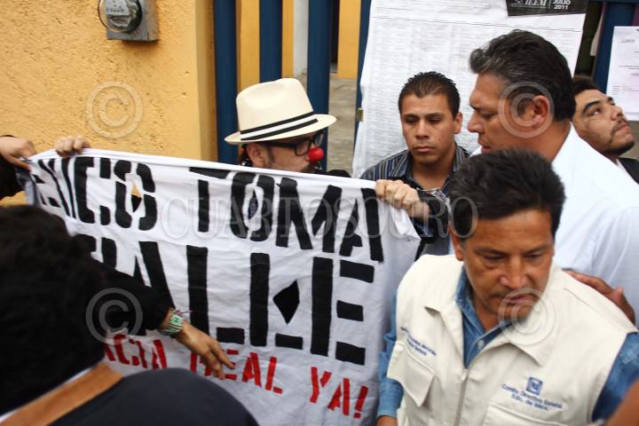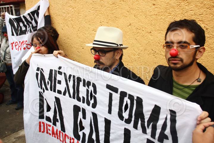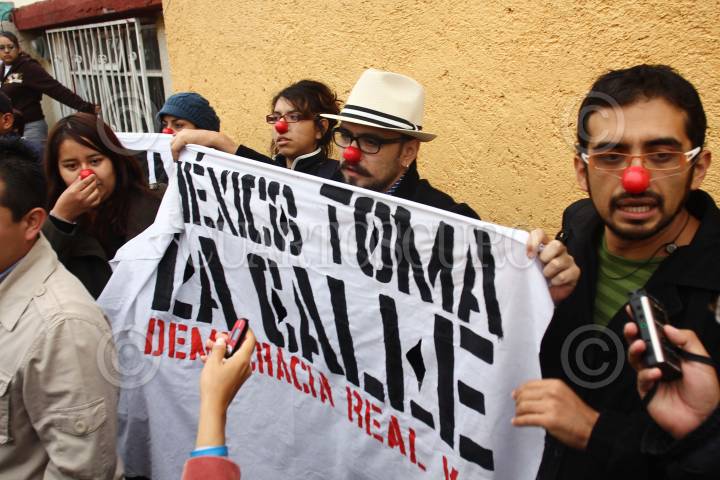 ECATEPEC, ESTADO DE MÉXICO, 03JULIO2011.- Integrantes de la organización civil “Democracia Real Ya” se manifestaron con pancartas y narices de payaso a la salida de la casilla donde el candidato a la coalición “Unidos Por Ti” del PRI, PVEM y PANAL a la gubernatura del Estado de México emitió su voto electoral. Algunas personas vestidos de civil intentaron quitarles las mantas. FOTO: SAÚL LÓPEZ/CUARTOSCURO.COM