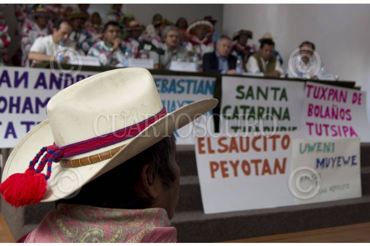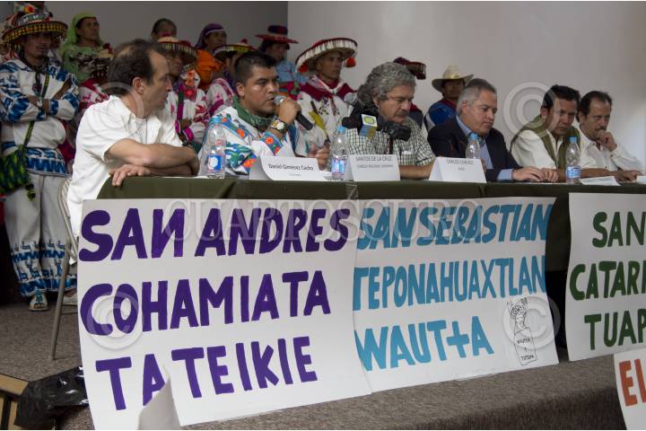 MÉXICO, D.F., 26OCTUBRE2011.- Desde que el gobierierno federal cedió Wirikuta (Real de catorce), área sagrada para el pueblo Wirrárika (huichol) a la empresa canadiense First Majestic, estos han encabezado un movimiento llamado "Salvemos Wirikuta" en el que exigen al gobierno Federal el respeto este territorio. Miembros de distintos poblados Huicholes provenientes de los estados de Zacatecas, Nayarit, Jalisco y San Luis potosí, ofrecieron una conferencia de prensa en la que participó el actor Daniel Giménez Cacho, el poeta Eduardo Vázquez, la actriz Ofelia Medina, el músico Alfonso Figueroa entre otras personajes solidarios, la conferencia se llevó a cabo en el Centro de Derechos Humanos Miguel Agustín Pro Juárez. FOTO: PEDRO ANZA/CUARTOSCURO.COM