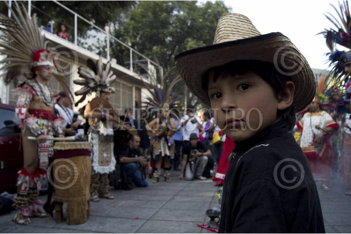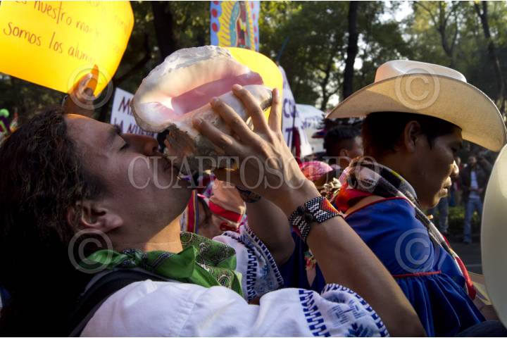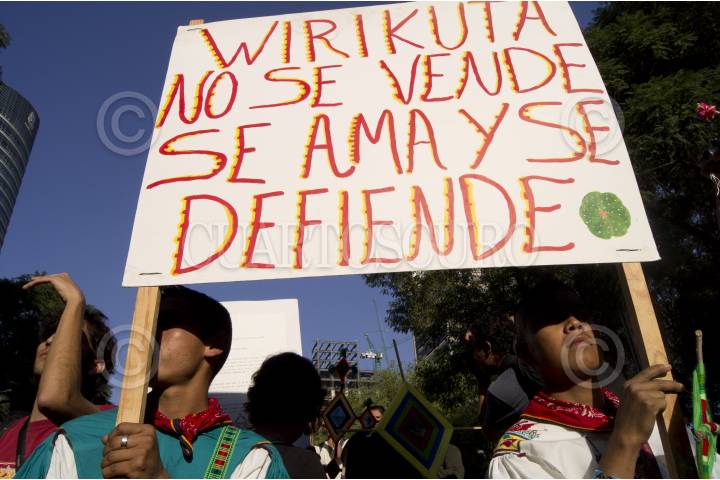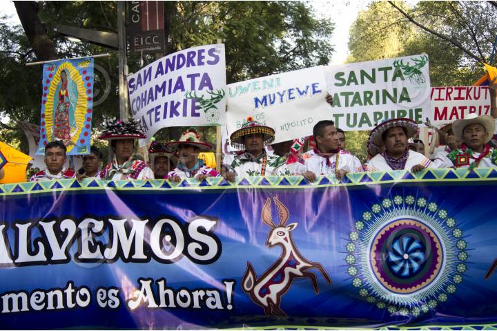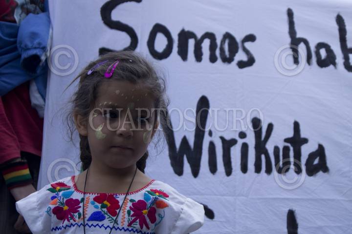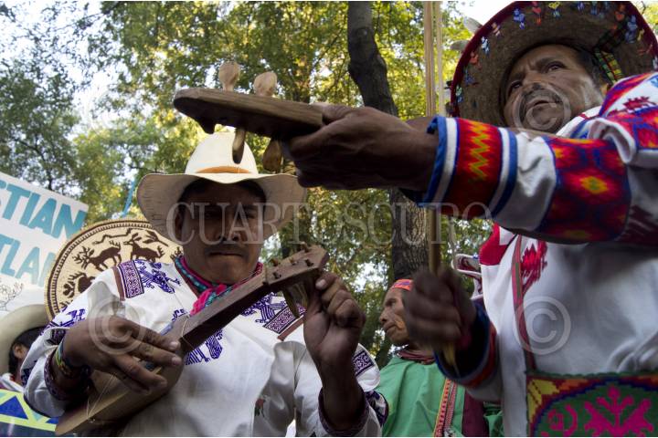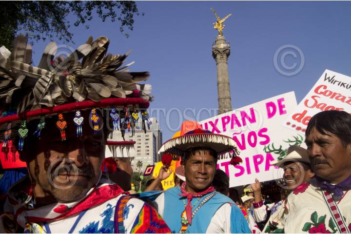 MÉXICO, D.F., 27OCTUBRE2011.- Integrantes del Frente en Defensa de Wiricuta Tamatsima Wah´a (Real de Catorce) marcharon del Ángel de la Independencia a la residencia oficial de los Pinos acompañado de diversas organizaciones indígenas, para exigir el rescate del sitio sagrado de los huicholes, los cuales son amenazados por empresas mineras y agroindustriales extranjeras. Al termino de la marcha una comisión fue recibida para hacer la petición al representante del ejecutivo de que cancele las concesiones. FOTO: PEDRO ANZA/CUARTOSCURO.COM