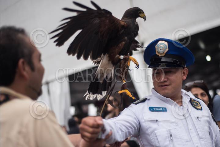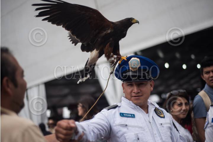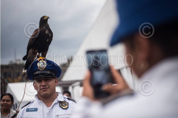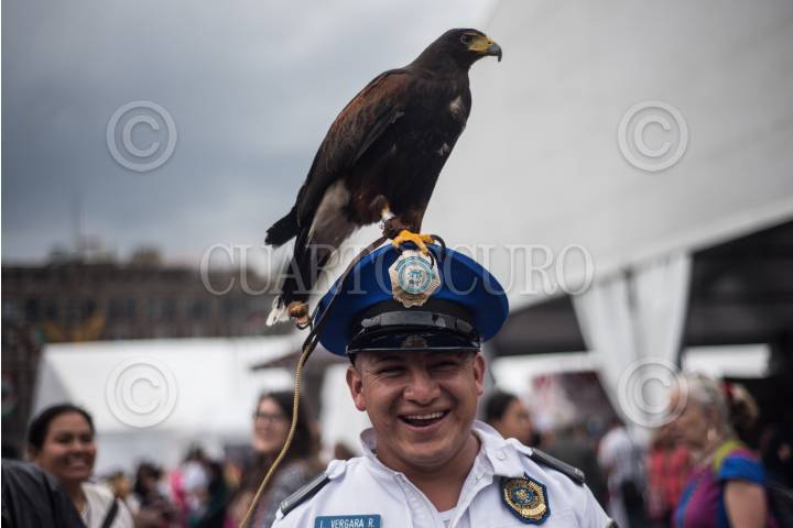 CIUDAD DE MÉXICO, 02SEPTIEMBRE2018.- Una águila real exhibida por una organización animal en el zócalo de la capital del país, se sube a la gorra de un policía capitalino mientras éste intentaba verla de cerca, por lo que aprovecho la situación para tomarse una fotografía con el ave. FOTO: MISAEL VALTIERRA / CUARTOSCURO.COM