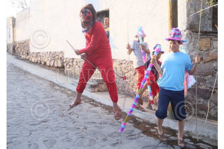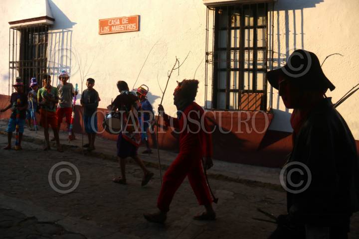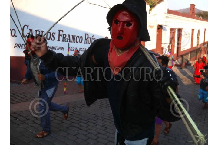 TLAQUILTENANGO, MORELOS, 29MARZO2024.-Los habitantes del pueblo de Huautla (situado al extremo sur del estado), participan de la celebración de Viernes Santo, cuya singularidad recae en un grupo que se denomina "Mototocos” (portando una máscara roja de edad antigua, y que son Judas, Barrabás y Batea, así como una mujer llamada Linterna o Mototoca) que recorre las calles y representa a los soldados romanos. Junto con los niños, los "Mototocos" azotan con varas largas a quienes los retan con un canto “Mototoco, viejo loco” o aventándoles agua. Imagen tomada la tarde de ayer en el Real de Huautla. FOTO: MARGARITO PÉREZ RETANA /CUARTOSCURO.COM