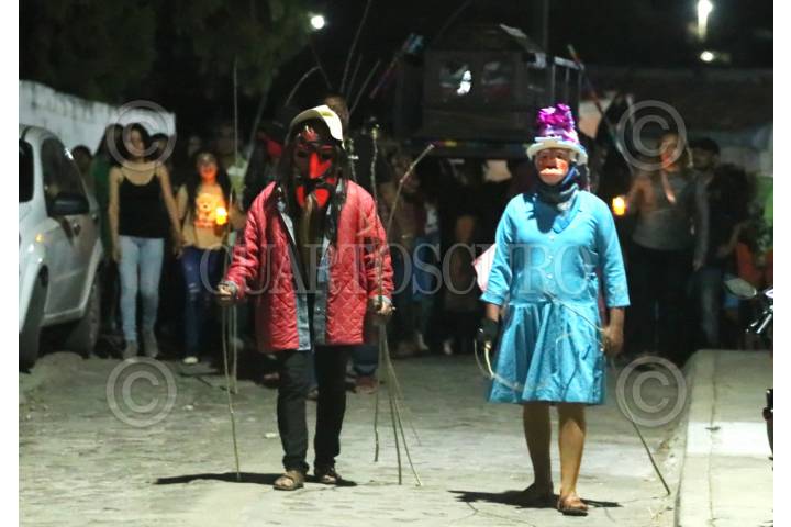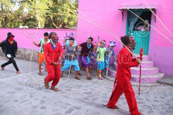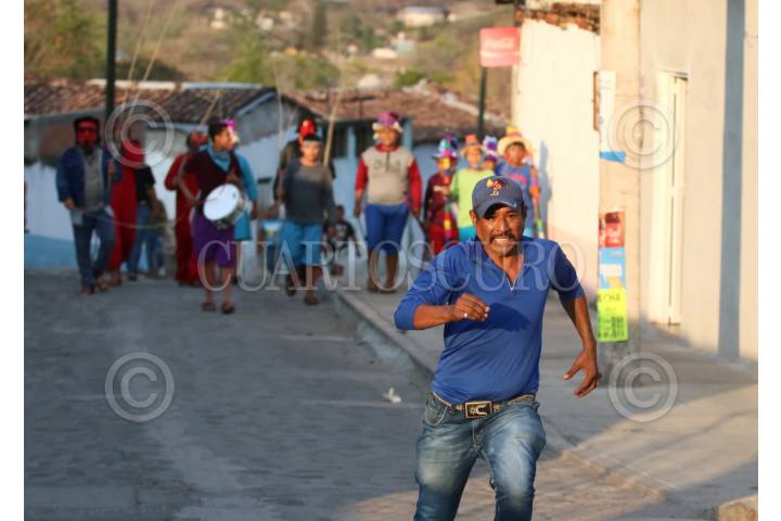 TLAQUILTENANGO, MORELOS, 29MARZO2024.-Los habitantes del pueblo de Huautla (situado al extremo sur del estado), participan de la celebración de Viernes Santo, cuya singularidad recae en un grupo que se denomina "Mototocos” (portando una máscara roja de edad antigua, y que son Judas, Barrabás y Batea, así como una mujer llamada Linterna o Mototoca) que recorre las calles y representa a los soldados romanos. Junto con los niños, los "Mototocos" azotan con varas largas a quienes los retan con un canto “Mototoco, viejo loco” o aventándoles agua. Imagen tomada la tarde de ayer en el Real de Huautla. FOTO: MARGARITO PÉREZ RETANA