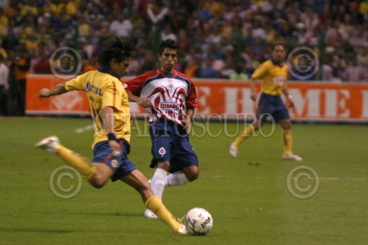 MÉXICO, D.F., 18MARZO2007.- El americanista Juan Mosqueda disputa un balón a José Magallón, en el partido que las Águilas del América se impusieron por 1-0 a las Chivas de Guadalajara. FOTO: ISAAC ESQUIVEL/CUARTOSCURO.COM