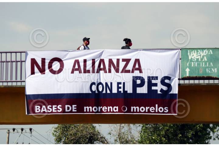 Durante esta mañana fueron colocadas varias mantas en todo el estado por militantes de base de MORENA, donde rechazan la alianza con el Partido Encuentro Social.