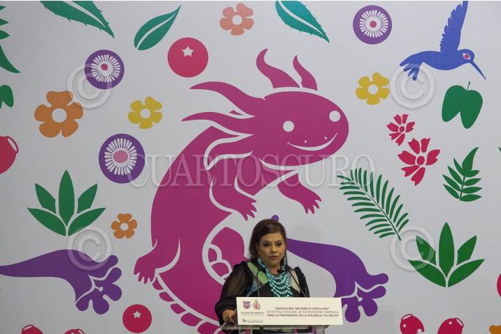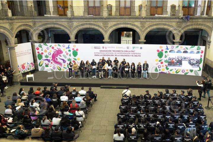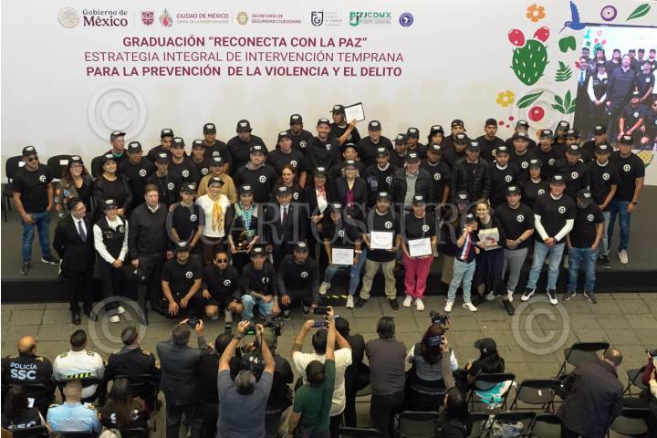 CIUDAD DE MÉXICO 01AGOSTO2025.- Clara Brugada, jefa de gobierno y Pablo Vázquez, titular de la Secretaria de Seguridad Ciudadana, encabezaron la Ceremonia de Graduación Reconecta con la Paz, estrategia integral de intervención temprana para la prevención de la violencia y el delito. FOTO:ROGELIO MORALES /CUARTOSCURO.COM