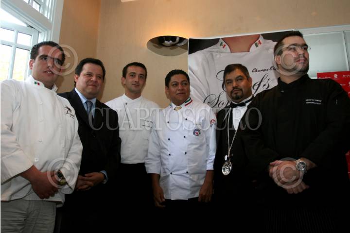 MÉXICO D.F. 27DICIEMBRE2007.-Gustavo Cortes, Victor Hugo Rodríguez de editorial Agueda acompañados de Michel Virues representante de un famoso restaurate, en conferencia de prensa dieron a conocer la convocatoria para la Foto con Mayor Numero de Chefs, que se realizara el proximo 26 de Enero en la columna del Angel de la Independencia, y con la cual se pretende ingresar al Records Guines. FOTO: GUILLERMO PEREA/CUARTOSCURO.COM