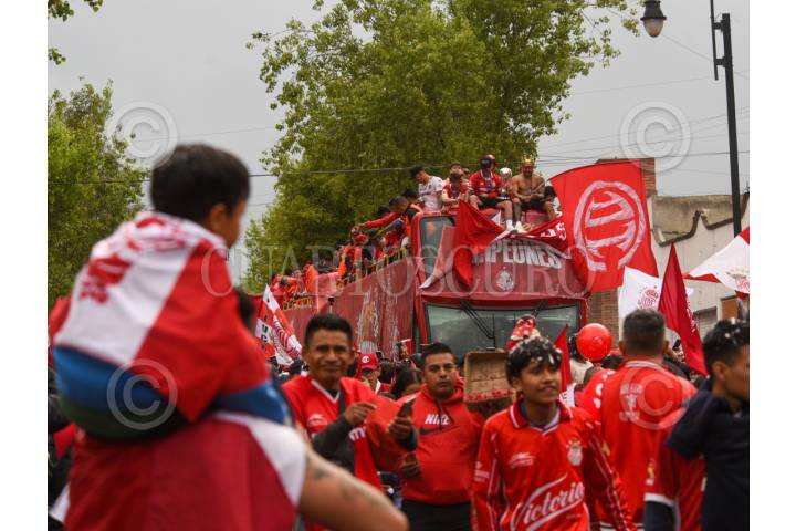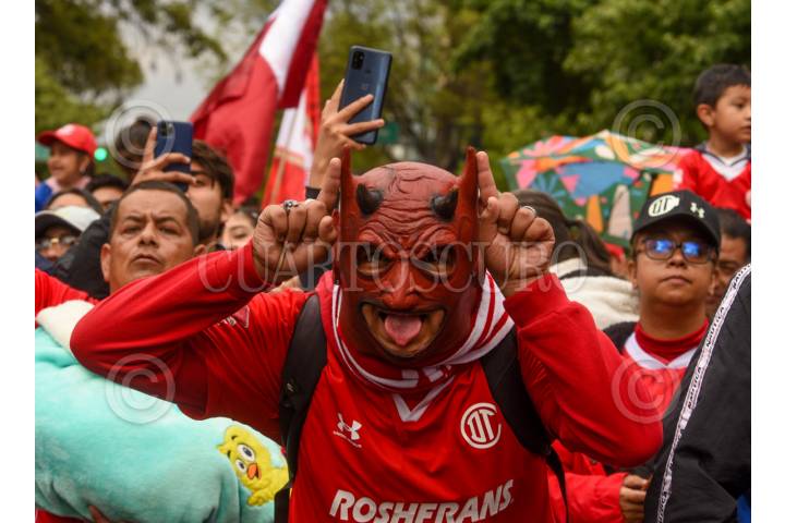 TOLUCA, ESTADO DE MÉXICO, 26MAYO2025.- Aficionafos de Los Diablos de Toluca Campeones del Clausura 2025 se dieron cita en el recorrido por las principales calles de la capital mexiquense que la escuadra escarlata realizó para agradecer y compartir con la afición esta victoria, las calles se vistieron de rojo y euforia, celebrando con sus ídolos del futbol. FOTO: CRISANTA ESPINOSA AGUILAR /CUARTOSCURO.COM