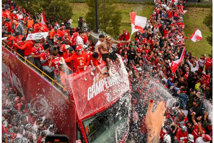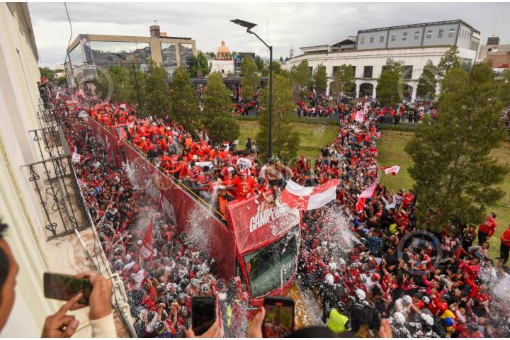TOLUCA, ESTADO DE MÉXICO, 26MAYO2025.- Jugadores de Los Diablos de Toluca Campeones del Clausura 2025 recorrieron las principales calles de la capital mexiquense para agradecer y compartir con la afición esta victoria, las calles se vistieron de rojo y euforia, celebrando con sus ídolos del futbol. FOTO: CRISANTA ESPINOSA AGUILAR /CUARTOSCURO.COM