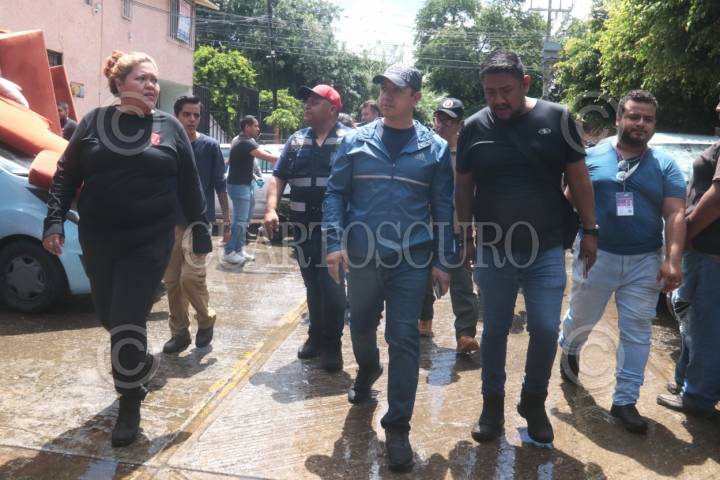 JIUTEPEC, MORELOS, 23AGOSTO2025.- La fuerte lluvia de la madrugada dejo severos daños en los municipios de Jiutepec y Emiliano Zapata. En la imagen, el presidente municipal Eder Rodríguez Casillas recorre la unidad habitacional La Joya de Agua que resulto severamente afectada. FOTO: MARGARITO PÉREZ RETANA/CUARTOSCURO.COM