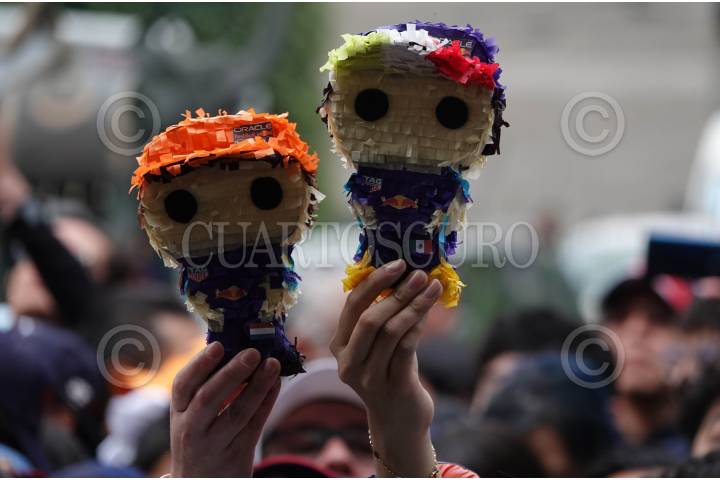 CIUDAD DE MÉXICO, 23OCTUBRE2024.- Aficionados sostienen dos piñatas inspiradas en los pilotos Sergio "Checo" Pérez y Max Verstappen durante la conferencia de prensa del piloto mexicano de cara a su participación en el Gran Premio de la Ciudad de México el próximo 27 de octubre de 2024. FOTO: GALO CAÑAS/CUARTOSCURO.COM