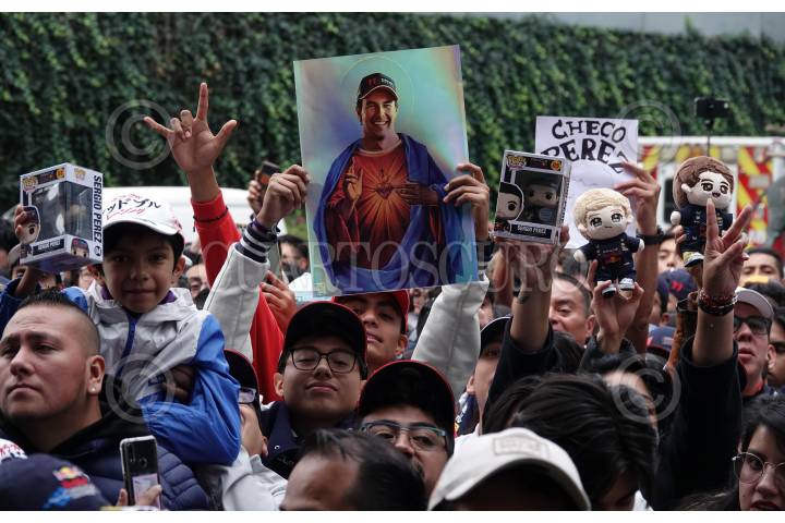 CIUDAD DE MÉXICO, 23OCTUBRE2024.- Un aficionado sostiene una imagen del sagrado corazón de Jesús con el rostro del piloto Sergio "Checo" Pérez durante la conferencia de prensa de cara a su participación en el Gran Premio de la Ciudad de México el próximo 27 de octubre de 2024. FOTO: GALO CAÑAS/CUARTOSCURO.COM