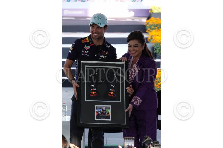 CIUDAD DE MÉXICO, 24OCTUBRE2024.- El piloto mexicano de Fórmula 1 Sergio "Checo" Pérez entrego una placa a Clara Brugada, jefa de gobierno de la Ciudad de México, previo al corte de listón de la Ciudad de México en las inmediaciones del Autódromo Hermanos Rodríguez de cara a la celebración del Gran Premio de la Ciudad de México de la Fórmula 1. FOTO: GALO CAÑAS/CUARTOSCURO.COM