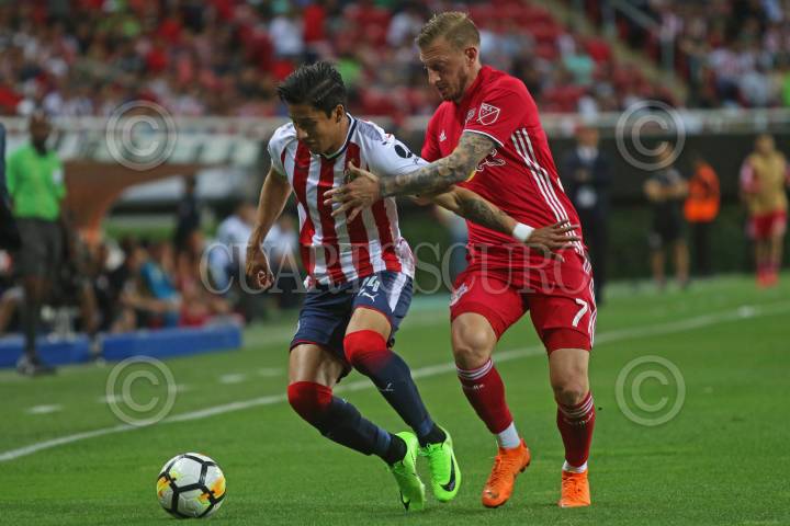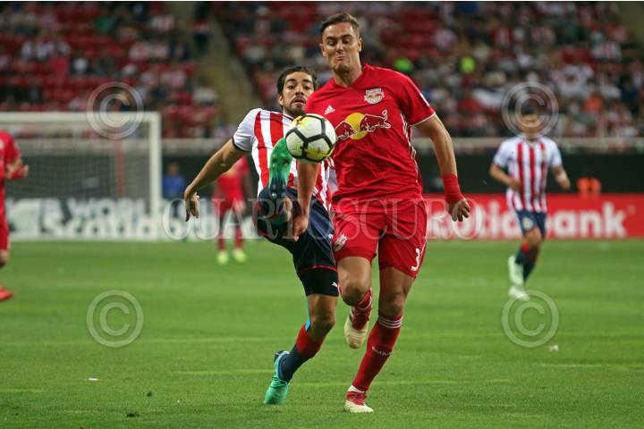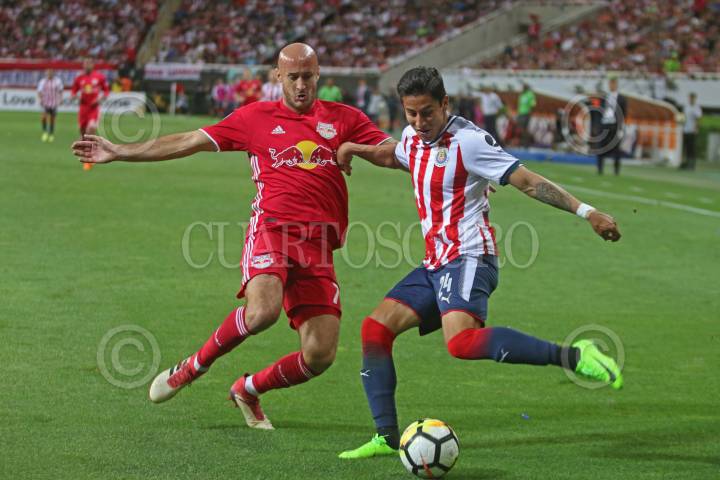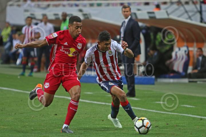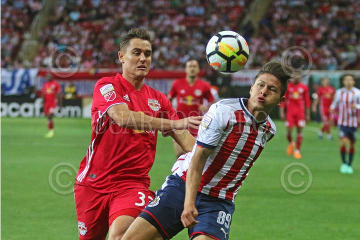 ZAPOPAN, JALISCO, 04ABRIL2018.- Las Chivas de Guadalajara (México) se enfrentan a Red Bulls de New York (USA) en el Estadio Akron y en partido correspondiente a la semifinal de ida de la Liga de Campeones de la Concacaf. En la imagen Carlos Cisneros jugador de Chivas disputa un balón a Aurelien Collin de Red Bulls. El marcador al final del juego fue de 1-0 a favor del equipo de casa. FOTO: FERNANDO CARRANZA GARCIA / CUARTOSCURO.COM