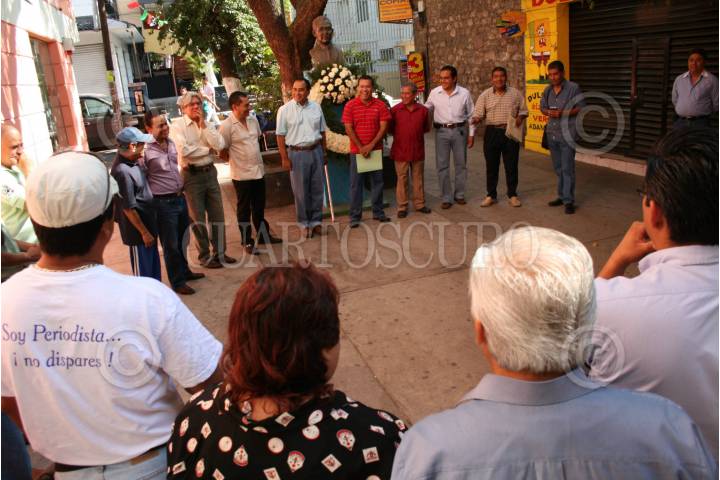 CHILPANCINGO, GUERRERO, 04ENERO2005.- Integrantes de la delegacion XVII del Sindicato Nacional de Redactores de la Prensa (SNRP), colocaron una ofrenda floral y montaron guardia de honor en el busto de Humberto Ochoa Campos en la Plaza de la Libertad de Expresión de la ciudad al conmemorarse un aniversario más del Día del Periodista. FOTO: Oscar Alvarado/CUARTOSCURO.COM