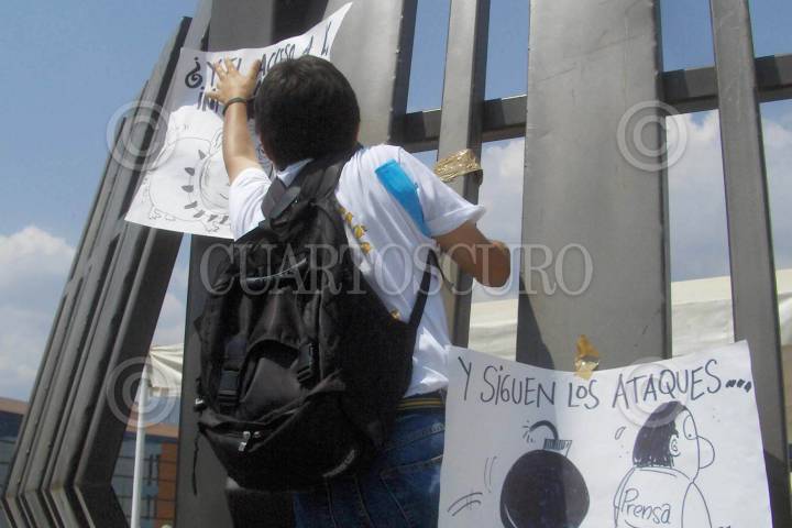 CHILPANCINGO, GUERRERO 03MAYO2006.- Compañeros integrantes de la delegacion XVII del Sindicato Nacional de Redactores de la Prensa (SNRP), pegan cartulinas a manera de protesta en la estructura que resguarda la entrada principal al palacio de gobierno, esto durante la protesta que realizaron ayer, para exigir un alto a las represiones y agravios contra periodistas, asi como respeto a la libertad de expresion, por parte del gobierno estatal, en el marco de la celebracion del "Dia Internacional de la Prensa". FOTO: Oscar Alvarado/CUARTOSCURO.COM