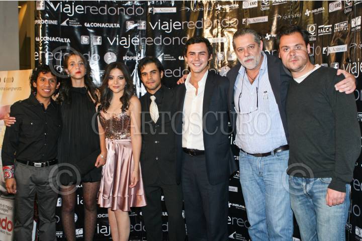 MÉXICO, D.F., 23MARZO2011.- Los actores Octavio Castro, Cassandra Ciangherotti, Teresa Ruiz, Felipe de Lara, Fernando Sansores, elenco del filme Viaje Redondo, así como el cineasta Gerardo Tort, posan para los fotógrafos durante la alfombra roja de dicha película, realizada en un centro comercial sobre Reforma. FOTO: ISAAC ESQUIVEL/CUARTOSCURO.COM