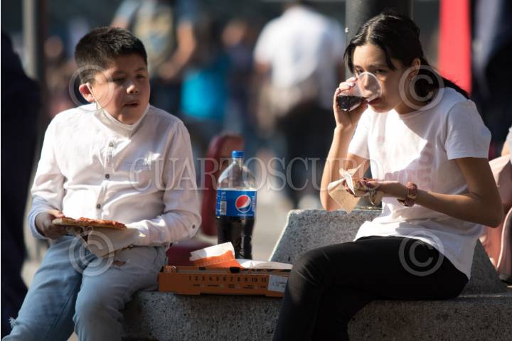 Dos niños se alimentan de pizza y refresco en la Glorieta de Insurgentes