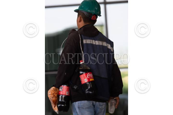 Un obrero carga de manera ingeniosa sus botellas de Coca Cola, para tomarse un descanso durante su jornada en el AIFA.