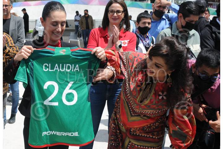 Claudia Sheinbaum recibe de regalo una playera de la selección mexicana con su nombre.