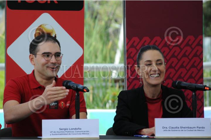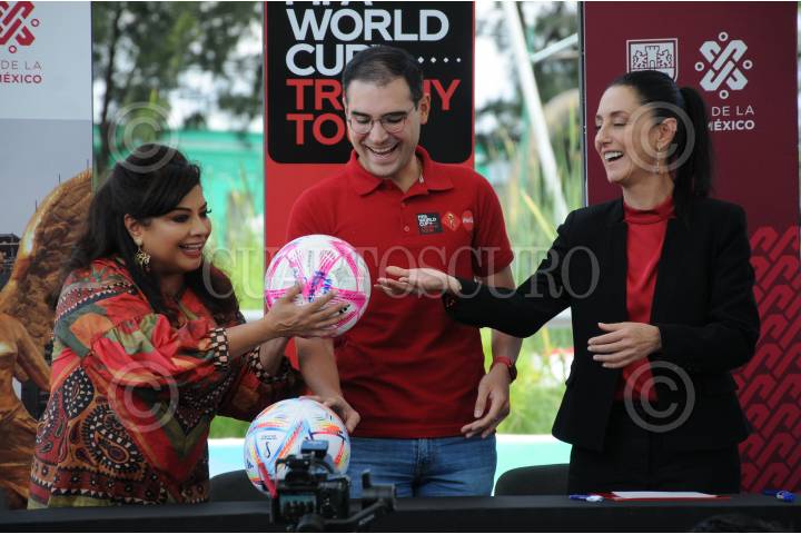 Claudia Sheinbaum, jefa de gobierno y Clara Brugada, alcaldesa de Iztapalapa, firman el balón oficial de la Copa del Mundo.