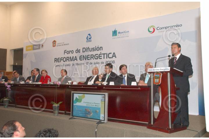 LERMA TOLUCA, EDOMEX, 17JULIO2008.- Georgina Kessel Martínez, secretaria de Energía y Enrique Peña Nieto, gobernador de la entidad, durante el foro de Difusión de la Reforma Energética, donde la funcionaria federal dijo que uno de los objetivos principales de la reforma petrolera, es dar seguridad energética al sostener la producción de crudo, gas y sus derivados. FOTO: CUARTOSCURO.COM