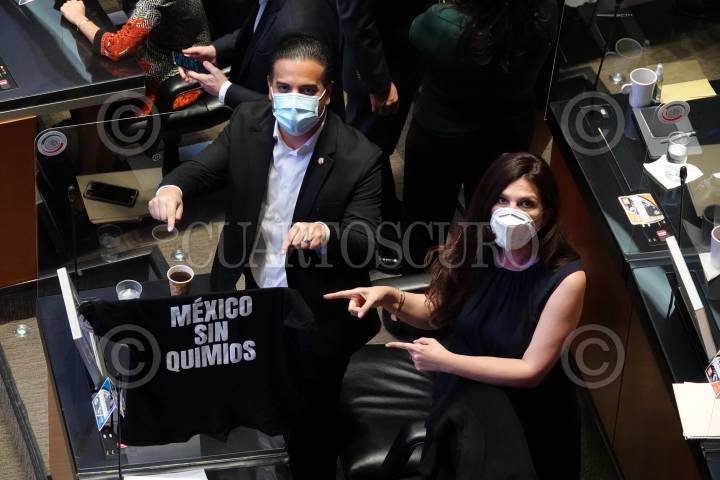 Dámian Zepeda y Kenia López Rabadán (PAN) muestran una playera con la leyenda "México Sin Quimios" durante la sesión del Senado de la Republica
